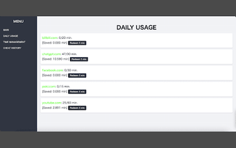 Web Gatekeeper är ett gratis tillägg för Chrome som hjälper användare att hantera sin tid online och upprätthålla digital disciplin. Med funktioner som anpassningsbara tidsgränser för webbplatser som Facebook och YouTube, samt fler nivåer av varningar, kan användare sätta upp personliga begränsningar. Tillägget erbjuder även en intuitiv instrumentpanel för att visa användarens disciplinpoäng och historik, vilket gör det enkelt att följa sina framsteg. Gamification-element som 'Redeem 5 min' och dagliga bonusar gör processen mer engagerande.